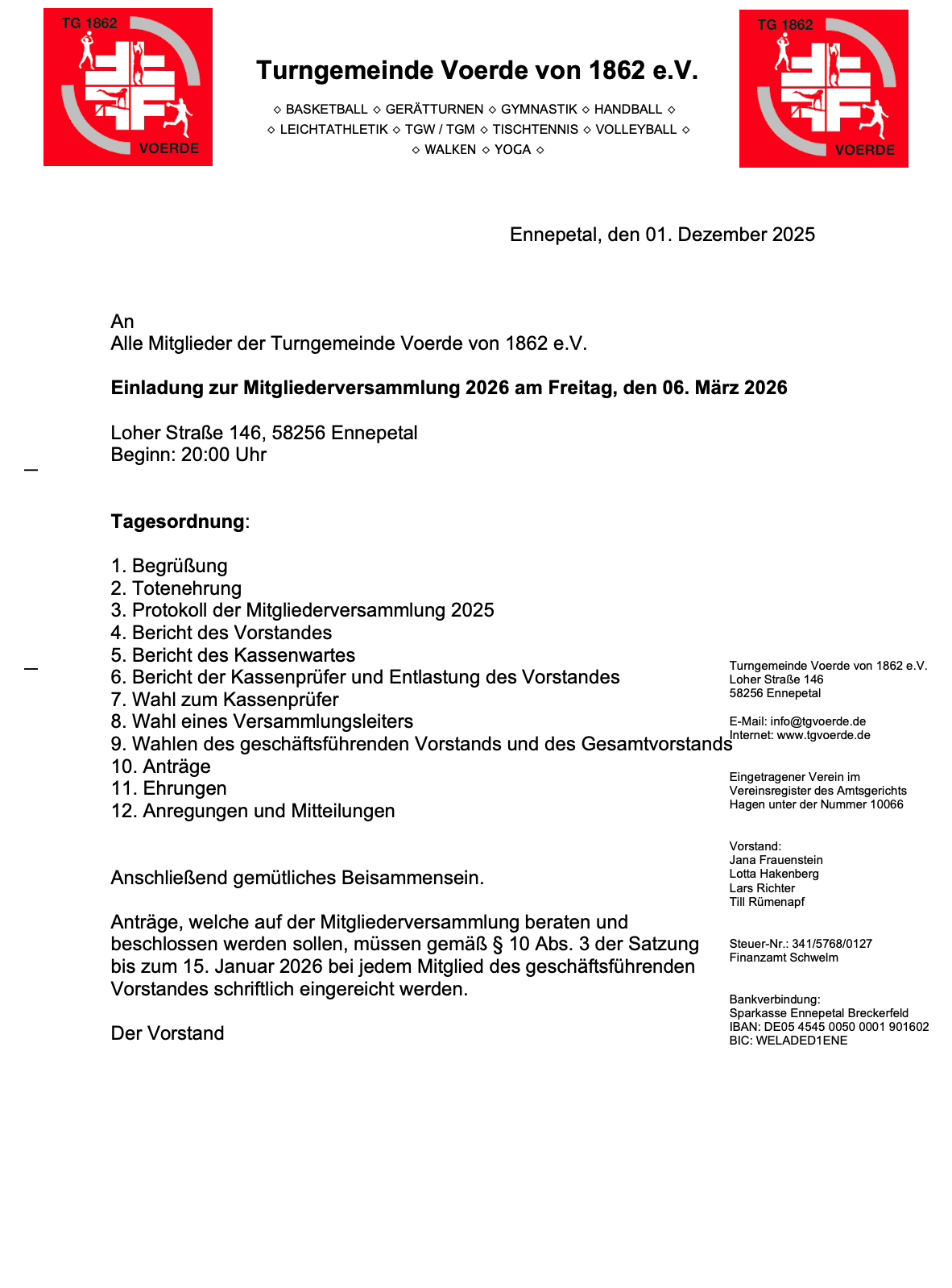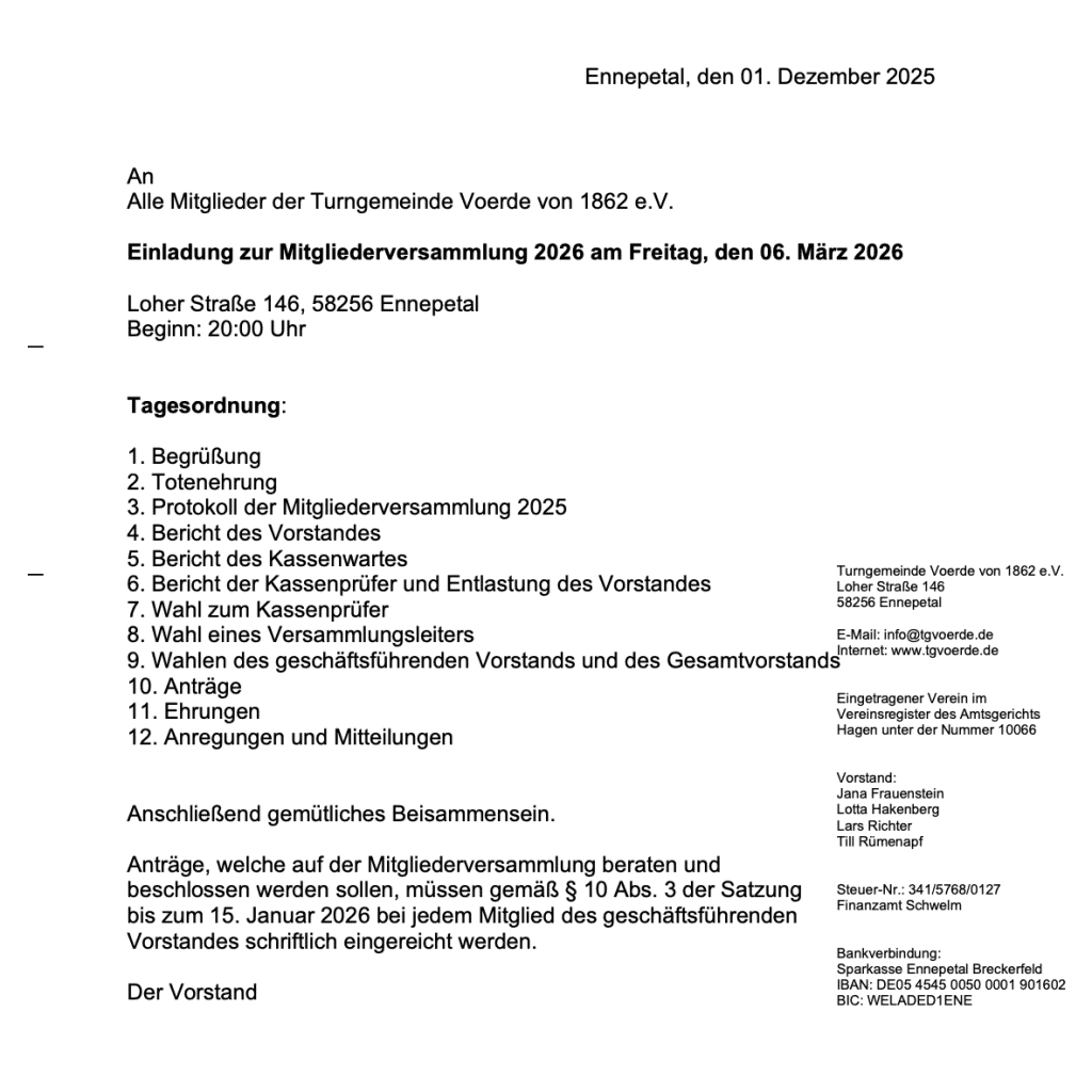 Anträge, welche auf der Mitgliederversammlung beraten und beschlossen werden sollen, müssen gemäß § 10 Abs. 3 der Satzung bis zum 15. Januar 2026 bei jedem Mitglied des geschäftsführenden Vorstandes schriftlich eingereicht werden.